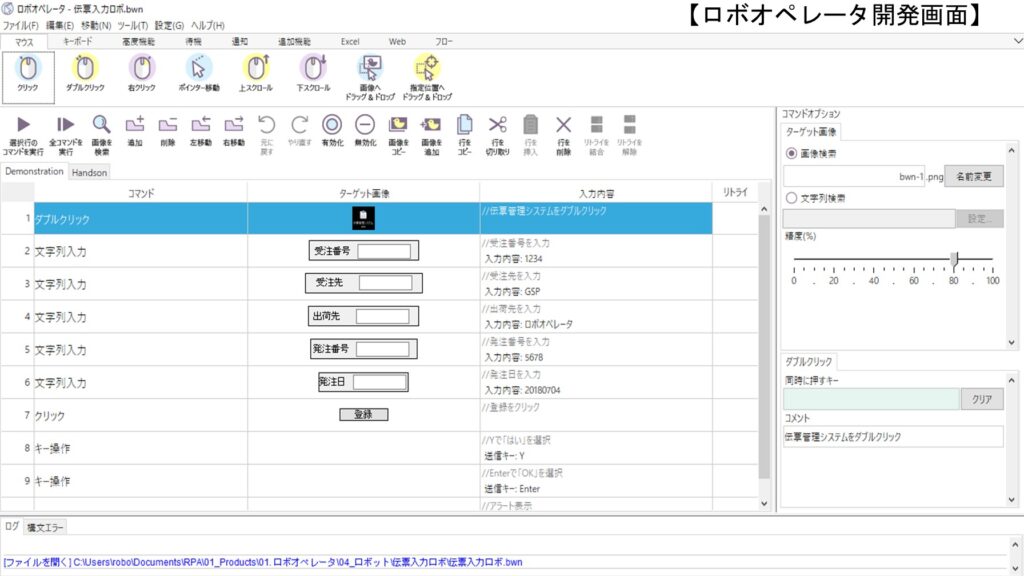 『ロボオペレータ』はプログラミングなしでもロボット作成ができるカンタンさが最大の特徴である。クリック、文字入力、キーボードといった普段使っている操作をたったの2~3ステップで設定できてしまう高い操作性もユーザーから非常に高い評価を得ている。